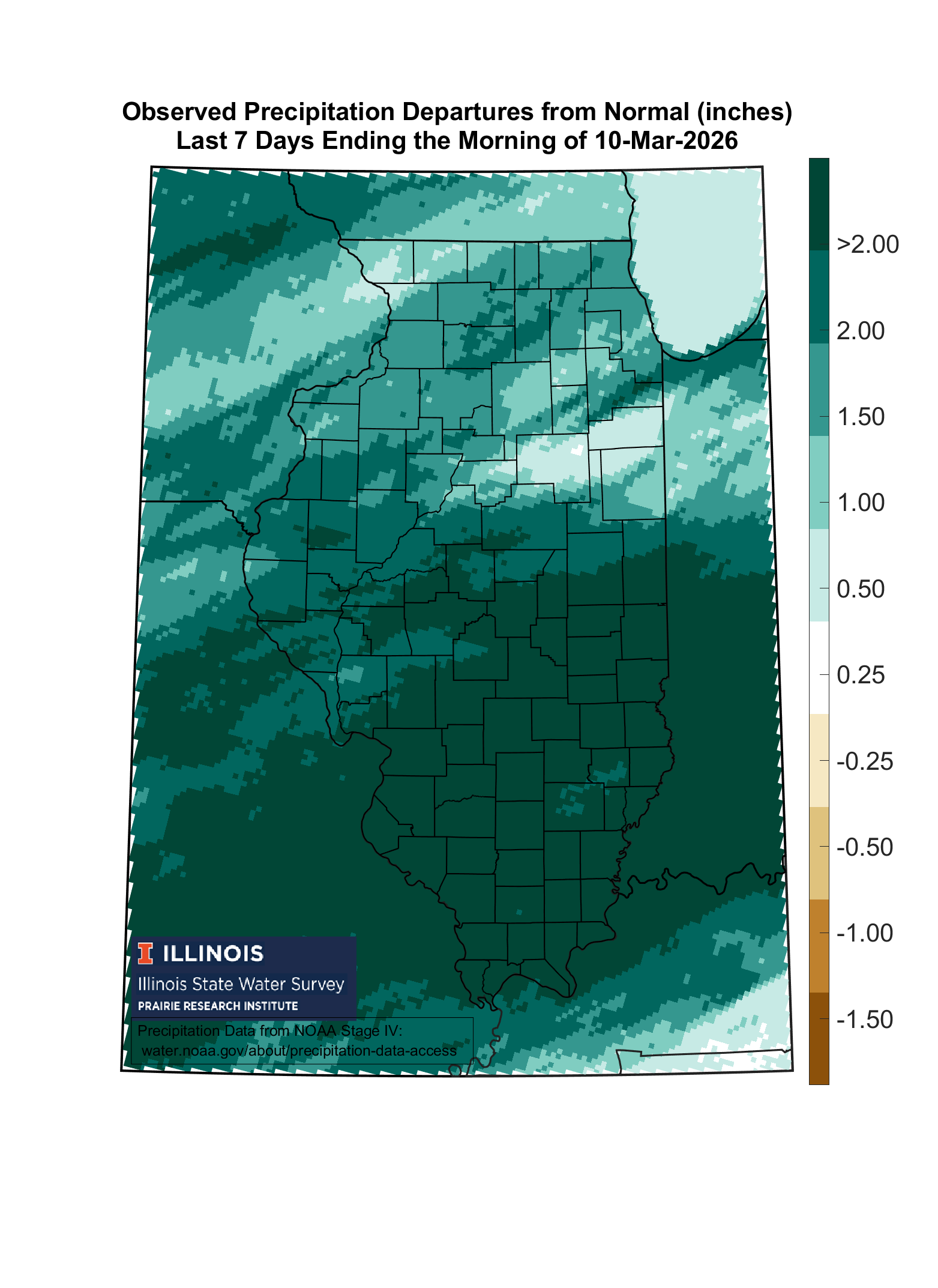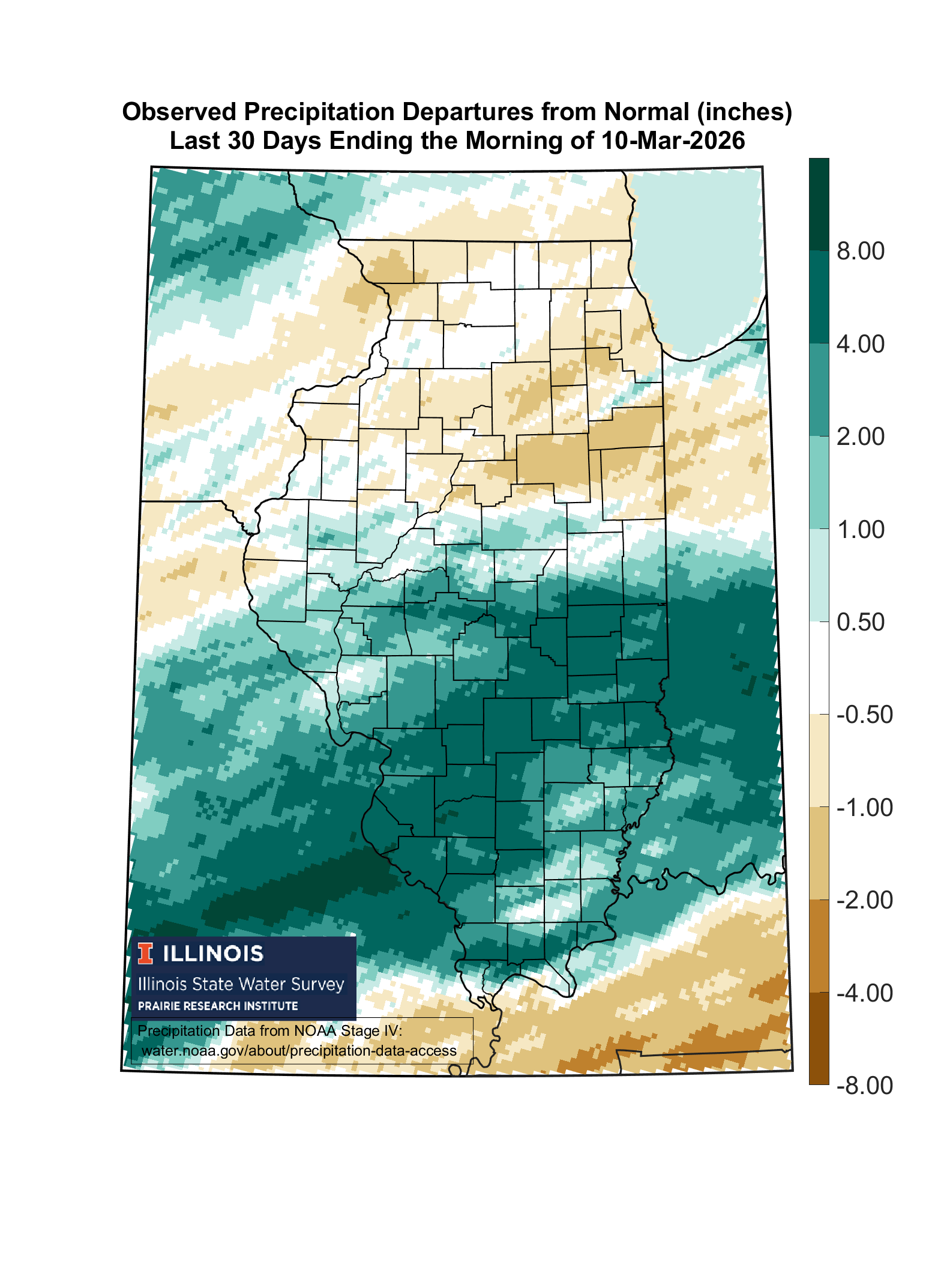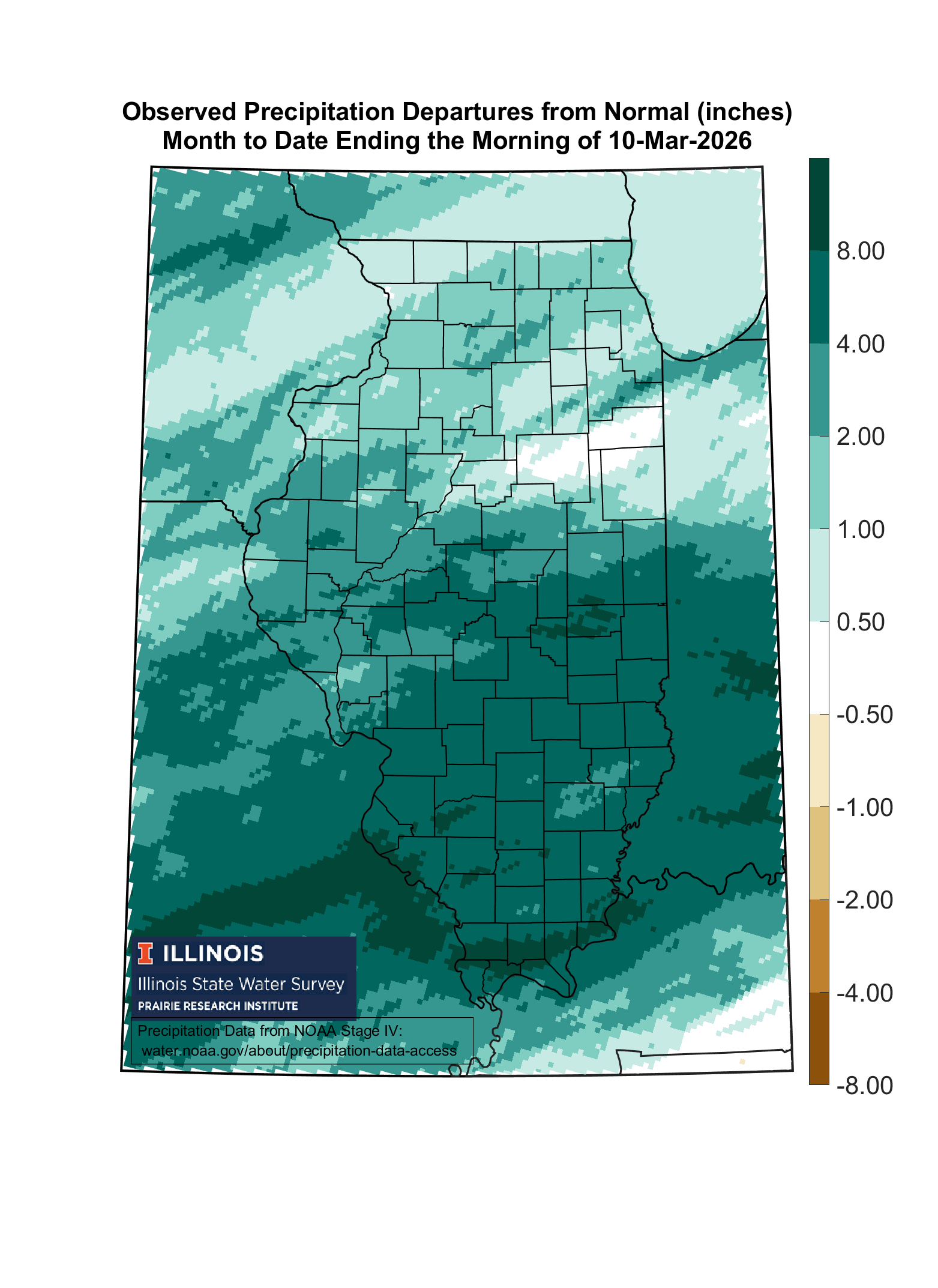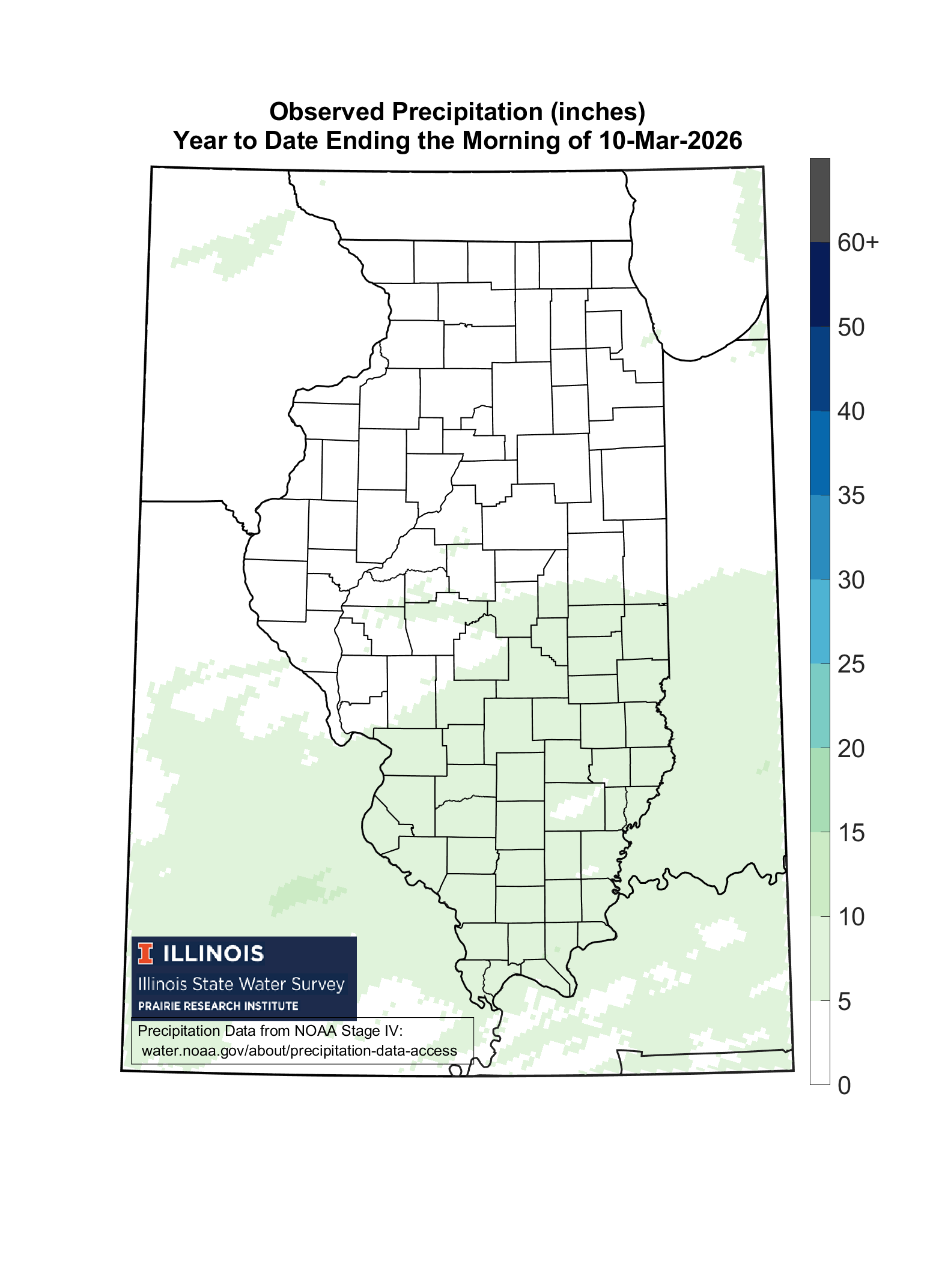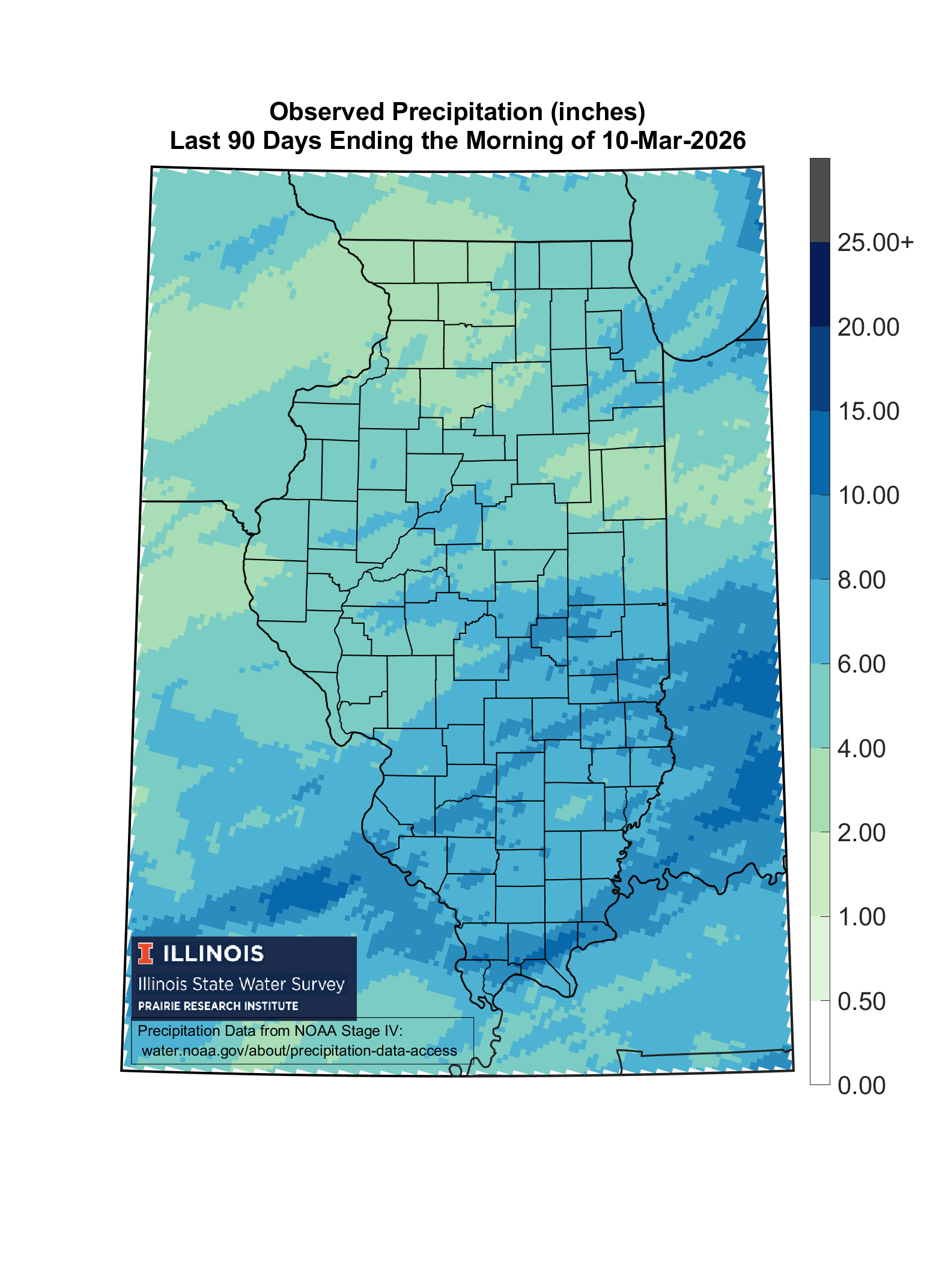 High-resolution precipitation maps based on National Weather Service radar-estimated precipitation, adjusted using available rain gauge data. This results in 4 km (or 2.5 mile) resolution maps of precipitation. These are typically updated by 4:15 p.m. each day for conditions through this morning. It takes a lot of behind-the-scenes processing to make this happen. Note, some changes were made to the links on May 2, 2018.